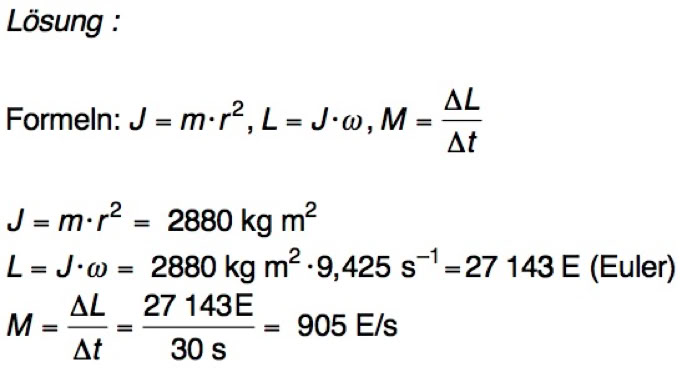 5. Ein Schwungrad: Die Masse von 2 t befindet sich in einem Abstand von 1,2 m von der Achse. Es dreht sich zunächst mit 1,5 Umdrehungen pro Sekunde. Dann wird es gleichmäßig abgebremst. Der Vorgang dauert 30 Sekunden. Wie stark ist der Drehimpulsstrom, der dabei in die Erde abfließt?