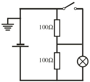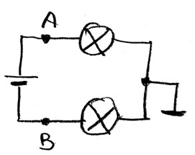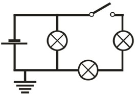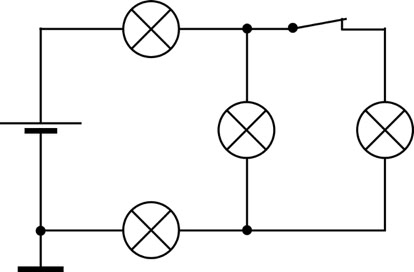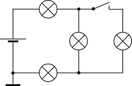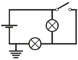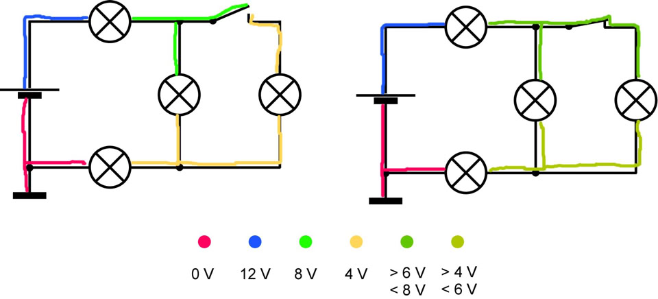 4. (a). Linkes Teilbild: Die Batterie erzeugt eine Spannung von 12 V. Die Lampen sind gleich gebaut. Welches sind die Potenziale der einzelnen Leitungsabschnitte? Wie leuchten die Lampen? (b) Rechtes Teilbild: Der Schalter wurde geschlossen. Was ändert sich im Vergleich zu (a)?