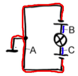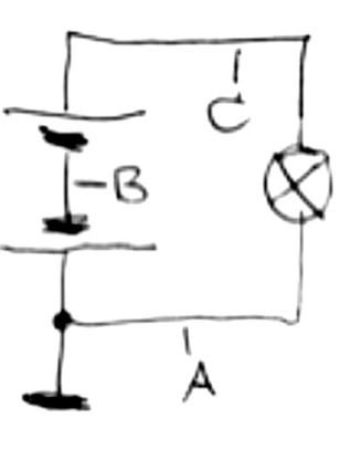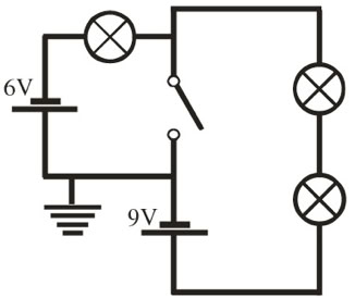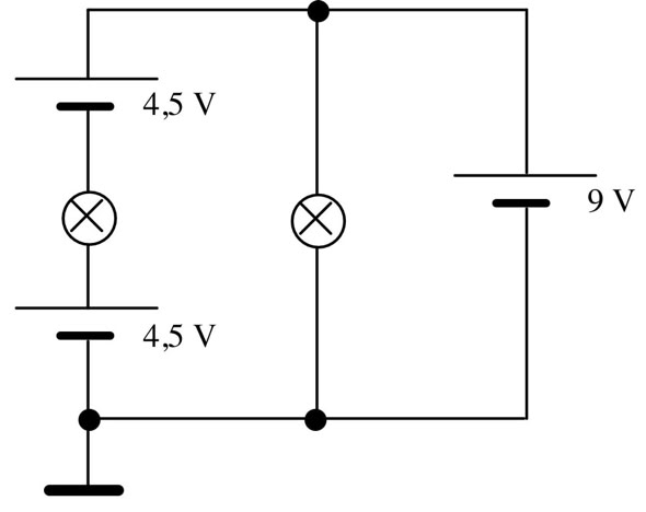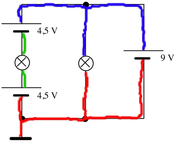 9. Markiere Stellen gleichen Potentials farbig. Gib die Potentialwerte der Leiterabschnitte an. Welche Spannung liegt an der Lampe? Was hältst du von der Schaltung? (Die Batterien sind gleichartig gebaut und liefern je 4,5 V.)