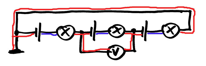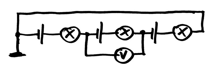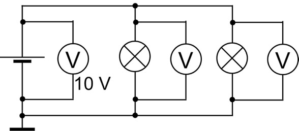 8. Drei gleichartige Batterien und drei gleiche Lampen. Jede Batterie liefert 4,5 V. Wie leuchten die Lampen (alle gleich, unterschiedlich oder gar nicht)? Gib die Potenzialwerte für alle Leitungsabschnitte an (farbig markieren). Was zeigt das Voltmeter an?