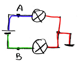 rot: 0 V, grün: 4,5 V, blau: 9 V An der linken Lampe liegteine Spannung von 0 V; sie leuchtet nicht. Die rechte leuchtet.
