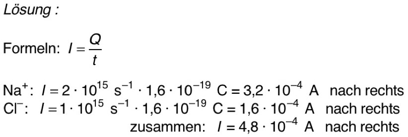 13.1 Elektrische Ladung und elektrischer Strom 1. In einem Elektrolyten fließen 2 ·1015 Na+-lonen pro Sekunde nach rechts und 1 ·1015 Cl–-Ionen pro Sekunde nach links. Wie groß ist die elektrische Stromstärke? (Elementarladung e = 1,6 ·10–19 C)