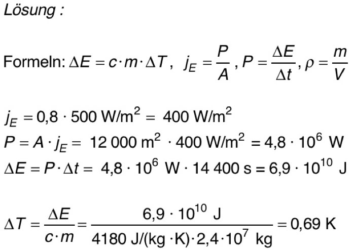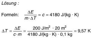 10. Durch einen Sonnenkollektor mit einer Oberfläche von 20 Quadratmetern fließen pro Sekunde 0,1 Liter Wasser. Der Kollektor sammelt pro Quadratmeter 200 W ein. Um wie viel erwärmt sich das Wasser während es durch den Kollektor fließt?