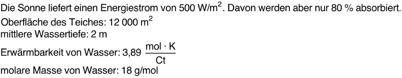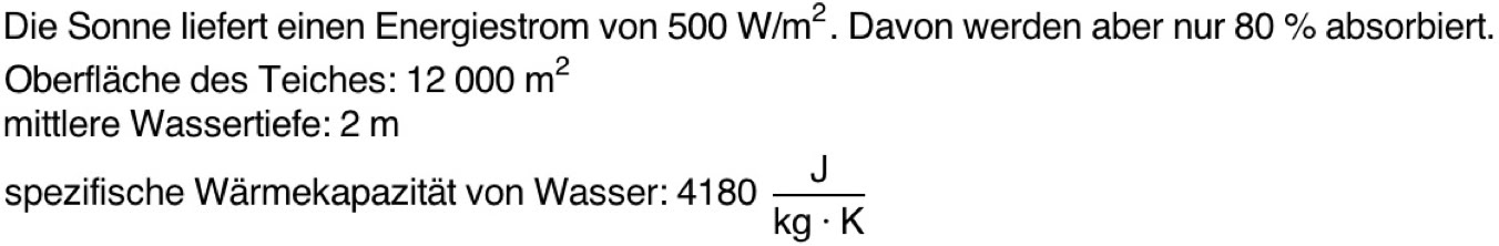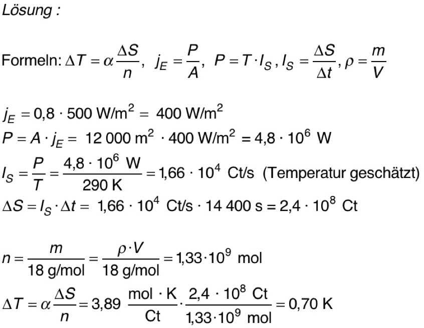 8. Die Sonne scheint vier Stunden lang auf einen Teich (1. Version.) (a) Um wie viel nimmt die Entropie des Wassers zu? (b) Um wie viel Grad erwärmt sich das Wasser?
