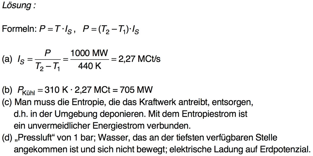 (a) Wie groß ist der Entropiestrom, der mit dem Kühlwasser wegfließt? (b) Wie groß ist der Energiestrom, den dieser Entropiestrom trägt? (c) Warum kann man mit dieser Energie nichts mehr anfangen? (d) Manchmal kann man in demselben Sinn mit „Pressluft“, mit Wasser oder mit elekrischer Ladung nichts anfangen.