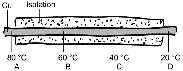 11. Durch einen Kupferstab, der nach der Seite hin isoliert ist, fließt ein Energiestrom von 10 W. In welche Richtung fließt er? Wie groß ist der Entropiestrom an den Stellen A, B, C und D? Wie ist der Unterschied zu erklären?