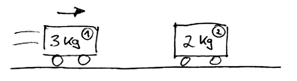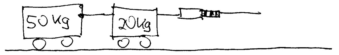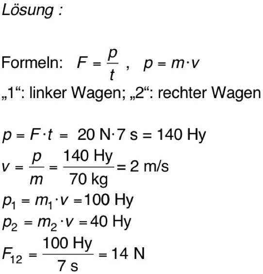 2. Die Wagen werden beschleunigt, indem rechts am Seil gezogen wird. Dabei zeigt der Kraftmesser einen Impulsstrom von 20 N an. Wieviel Impuls hat der vordere Wagen nach 7 s, wieviel hat der hintere Wagen nach 7 s? (Nimm Reibungsfreiheit an.) Welcher Impulsstrom fließt beim Beschleunigen durch die Kupplung zwischen den beiden Wagen?
