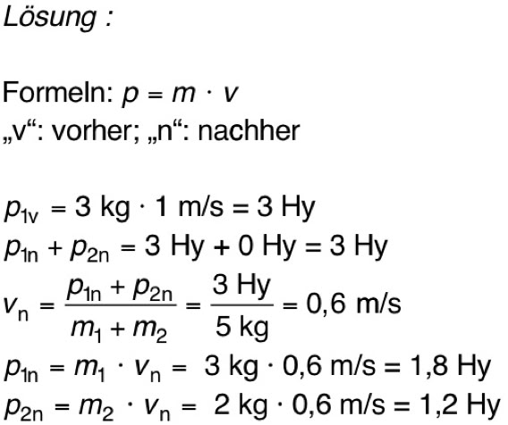 (a) ΔpMilly = F ·Δt = 150 N · 2 s = 300 Hy (b) ΔpWilly= – 300 Hy (Der gesamte Impuls von Milly und Lilly muss gleich bleiben, nämlich wie am Anfang gleich 0 Hy. (c) Nein. Milly legt eine größere Strecke zurück. Weil Ihre Masse kleiner ist, ist der Betrag ihrer Geschwindigkeit größer und damit auch der zurückgelegte Weg