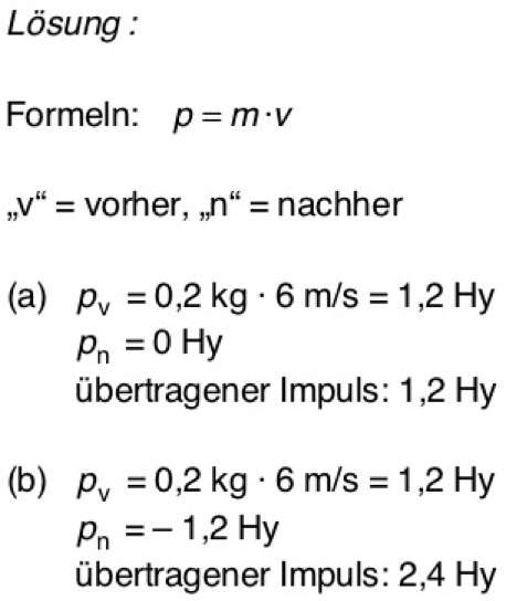 (b) Ein elastischer Ball der Masse 200 g prallt mit der Geschwindigkeit 6 m/s senkrecht gegen eine Wand. Wie viel Impuls gibt der Ball an die Wand ab?