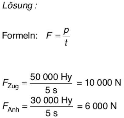7. Ein Lastzug fährt aus dem Stand an. Sein Impuls nimmt gleichmäßig zu. Nach fünf Sekunden hat die Zugmaschine 20 000 Hy, der Anhänger 30 000 Hy. Wie groß ist bei diesem Vorgang der Impulsstrom in die Zugmaschine und der von der Zugmaschine zum Anhänger? (Reibung soll vernachlässigt werden.)