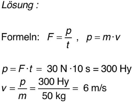 6. Ein gut gelagerter Wagen wird beschleunigt, indem man an ihm zieht. Ein Kraftmesser zeigt, dass ein Impulsstrom von 30 N in den Wagen fließt. Es wird 10 Sekunden lang gezogen. Wie groß ist die Endgeschwindigkeit? (Der Wagen wiegt 50 kg.)