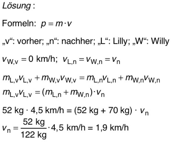 3. Willy (70 kg) und Lilly (52 kg) sind mit Inline-Skates unterwegs. Willy steht still, Lilly kommt mit 4,5 km/h von hinten angefahren und hält sich an Willy fest. Mit welcher Geschwindigkeit rollen sie beide weiter? (Angabe wieder in km/h)