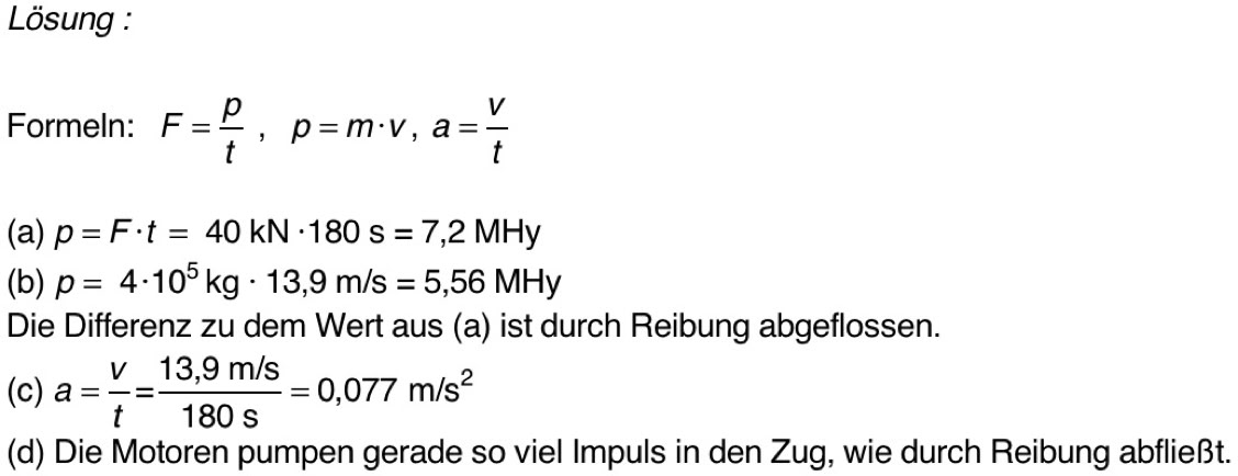 5. Ein Zug der Masse 400 t steht auf waagrechter Strecke. Die Motoren der Lokomotive pumpen nun Impuls in den Zug hinein, und zwar fließt 3 Minuten lang ein Impulsstrom von 40 kN. (a) Wie viel Impuls ist dann insgesamt in den Zug hineingepumpt worden? Der Zug hat nach diesen 3 Minuten eine Geschwindigkeit von 50 km/h. (b) Wie viel Impuls hat der Zug nach 3 Minuten? Vergleiche mit dem vorher berechneten Impulswert und erkläre. (c) Wie groß ist während der 3 Minuten ungefähr die Beschleunigung? (d) Eine viertel Stunde später fährt der Zug mit konstanter Geschwindigkeit. Die Motoren arbeiten immer noch. Was kann man zum Impulsstrom sagen?