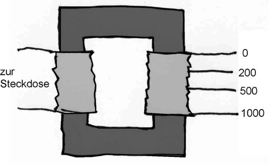 Lösung: Jeder der beiden Transformatoren kann die Spannung auf 1/4, 1/2, das Einfache, das Doppelte oder das Vierfache der Ausgangsspannung verändern. Für beide zusammen ist das Produkt aus zwei Zahlen maßgebend. Jede dieser Zahlen kann sein: 1/4, 1/2, 1, 2 und 4. So erhält man als Übersetzungsfaktor: 1/16, 1/8, 1/4, 1/2, 1, 2, 4, 8 oder 16. Um etwa 1/8 der Ausgangsspannung zu erhalten, baut man Transformatoren mit den Windungszahlen 1000/250 und 1000/500 auf.