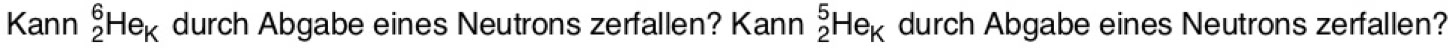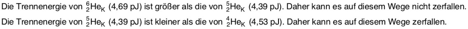 Lösung: Die Bilanz der leptonischen Ladung stimmt nicht. Zufügen eines Antineutrinos auf der rechten Seite bringt die Reaktion in Ordnung. Die gesamte Ruhenergie der Teilchen auf der linken Seite ist um 5,02 pJ größer als die der Teilchen auf der rechten Seit (mit Tabelle berechnen). Die Reaktion kann also laufen.