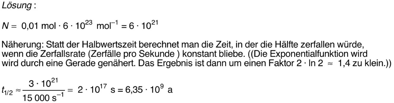 6. Man untersucht ein instabiles Nuklid, und zwar eine Menge von 0,01 mol. Man stellt fest, dass pro Sekunde etwa 15 000 Kerne zerfallen. Gib eine grobe Abschätzung der Halbwertszeit. Drück das Ergebnis in Jahren aus.