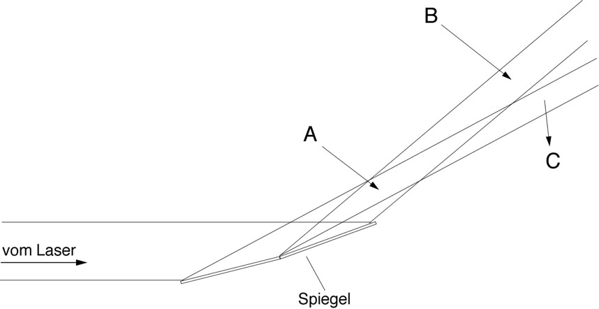 4. Auf zwei leicht gegeneinander geneigte Spiegel trifft ein Laserstrahl, siehe Abbildung. (a) Was sieht man auf einem weißen Schirm, den man zunächst bei A, dann bei B und bei C aufstellt? Was verändert sich bei A, wenn man die eine Spiegelhälfte abdeckt? (b) Der Laserstrahl wird sehr stark abgeschwächt, und es wird bei A eine photographische Aufnahme gemacht. Wie sieht diese aus, wenn nur eine sehr kurze Zeit belichtet wurde? Wie sieht sie aus, wenn länger belichtet wird? (c) Wie sieht der entwickelte Film aus, wenn während der Belichtung die eine Hälfte des Spiegels abgedeckt wurde?