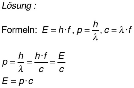 3. Berechne für Photonen den Zusammenhang zwischen Energie und Impuls, indem du vom Zusammenhang zwischen Energie und Frequenz und dem Zusammenhang zwischen Impuls und Wellenlänge ausgehst.