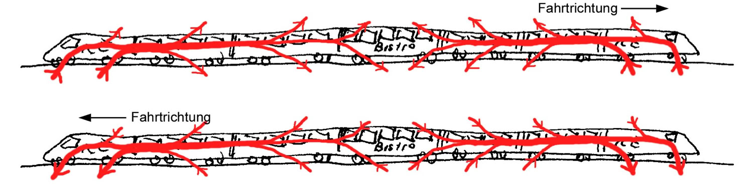 1. Der ICE 1 hat zwei „Triebköpfe“: einen, der zieht und einen hinten, der schiebt. Skizziere den Weg des Impulses bei voller Fahrt nach rechts (positive Richtung) und nach links (negative Richtung).