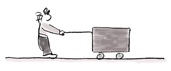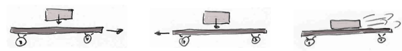 (b) Das Fahrzeug rollt nach links. Von oben fällt ein Klotz darauf. Was passiert mit dem Impuls von Klotz und Fahrzeug?