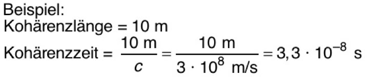 Lösung: Er sieht keine Interferenzstreifen. Auch bei einer großen Kohärenzlänge bleiben die Lichtwellen nur für sehr kurze Zeitintervalle im Takt. Das Interfererenzbild wackelt also sehr schnell hin und her.